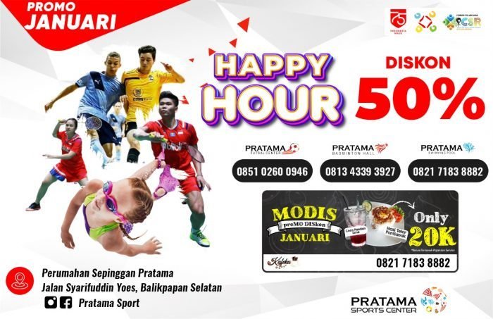 Menariknya di Pratama Sports Center ini memiliki program promo yang berbeda setiap bulan atau harinya. Dan kali ini promo menarik awal tahun di bulan Januari 2021, Pratama Sports Center memberikan promo yaitu Happy Hour diskon 50% di Pratama Futsal Center, Pratama Swimming Pool, Pratama Badminton Hall dan Paket MODIS (proMO DISkon) di KafeKu.