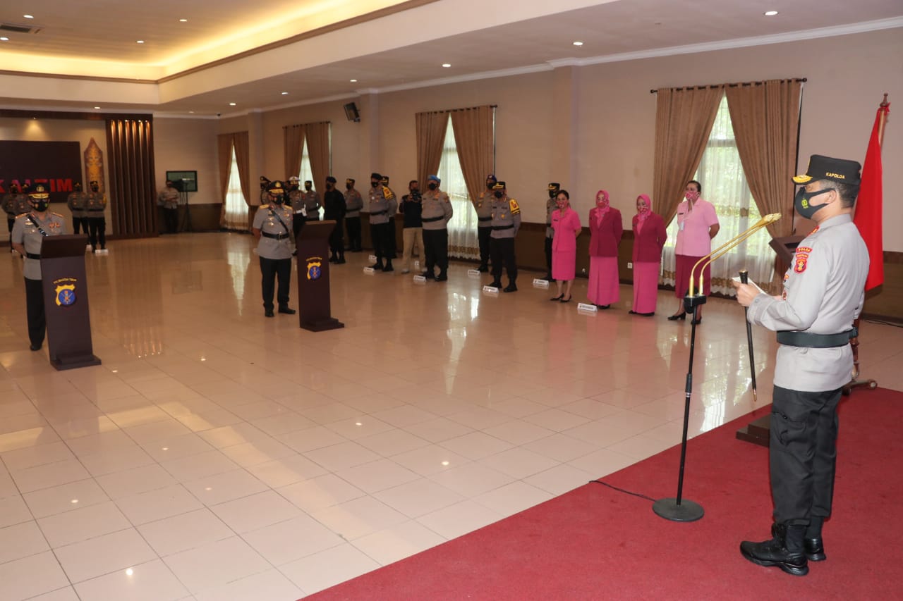 “Jadikan momentum ini untuk memacu dan meningkatkan semangat, disiplin dan etos kerja dalam pelaksanaan tugas Polda Kaltim dan memberikan pengabdian yang terbaik kepada masyarakat, bangsa dan Negara secara Profesional, Modern dan Terpercaya,” pesan Kapolda Kaltim. Kabid Humas Polda Kaltim Kombes Pol. Ade Yaya Suryana, S.I.K., M.H., menerangkan kegiatan serah terima Wakapolda Kaltim dari Brigjen Pol. Drs. Irlan Kustian, S.H., kepada Brigjen Pol. Drs. Hariyanto, S.H., M.H., berlangsung dengan tetap mengutamakan protokol Kesehatan yang ketat.