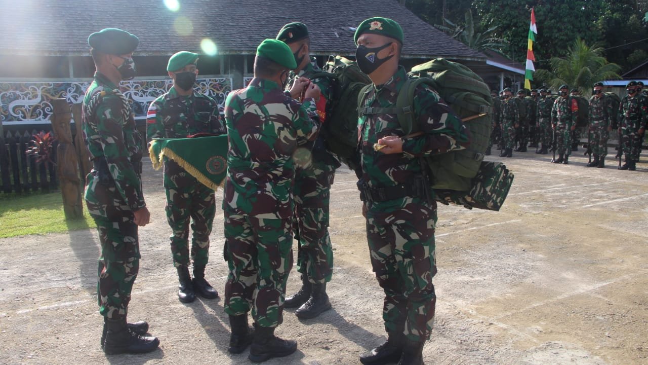 Upacara serah terima Satgas Pamtas RI-Malaysia yang dipimpin oleh Danrem 092/MRL yang juga selaku Dankolakops Satgas Pamtas RI-Malaysia TA. 2021 ini dilaksanakan di halaman balai adat yang berada di kampung Batu Majang Kec. Long Bagun Kab. Mahulu Provinsi Kalimantan Timur, Rabu (20/1/2021).