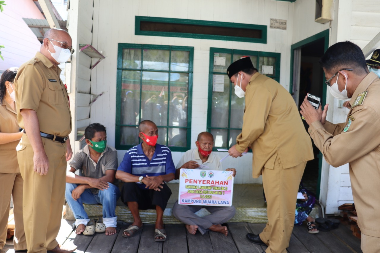 BorneoFlash.com, SENDAWAR - Bupati Kutai Barat FX Yapan menyerahkan Bantuan Langsung Tunai (BLT) kepada masyarakat langsung di tiga lokasi, Perdana di tahun 2021 guna membantu masyarakat dalam dampak pandemi Corona Virus Disease (Covid-19).