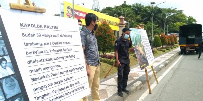 BorneoFlash.com, BALIKPAPAN – Jaringan Advokasi Tambang (Jatam) Kaltim, bersama Lembaga Bantuan Hukum (LBH) Samarinda, dan Lembaga-Lembaga Mahasiswa di Balikpapan, menggelar aksi damai di halaman Mapolda Kaltim Balikpapan pada Sabtu (29/5/2021).