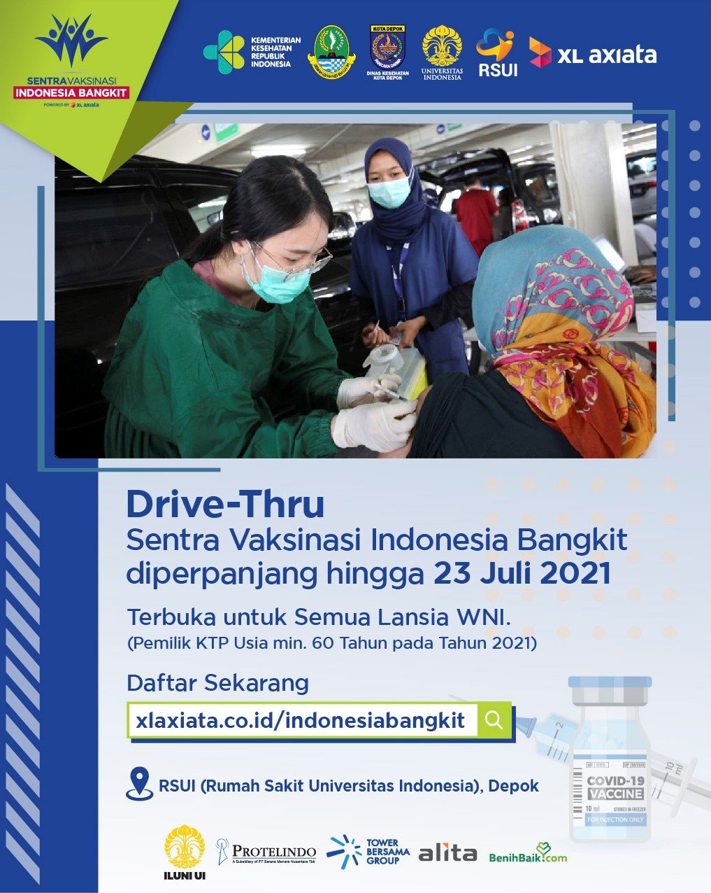 “Kami bertekad untuk terus membantu pemerintah dalam mempercepat vaksinasi kepada kalangan prioritas warga berusia 60 tahun ke atas di wilayah Jabodetabek dan sekitarnya, sehingga Sentra Vaksin Indonesia Bangkit kami perpanjang hingga 23 Juli 2021. Kali ini, tidak hanya Lansia warga Depok, Lansia Warga Negara Indonesia bisa ikut memanfaatkan layanan di sini.”