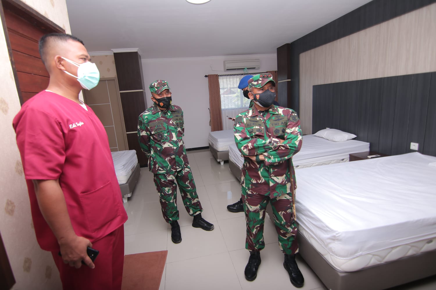 BorneoFlash.com, BALIKPAPAN - Pangdam VI/Mulawarman Mayjen TNI Heri Wiranto, S.E., M.M., M.Tr. (Han) didampingi beberapa pejabat di lingkungan Kodam VI/Mlw melaksanakan peninjauan langsung tempat isolasi Covid-19 yang berada di Asrama Haji Balikpapan, Selasa (27/7/2021).