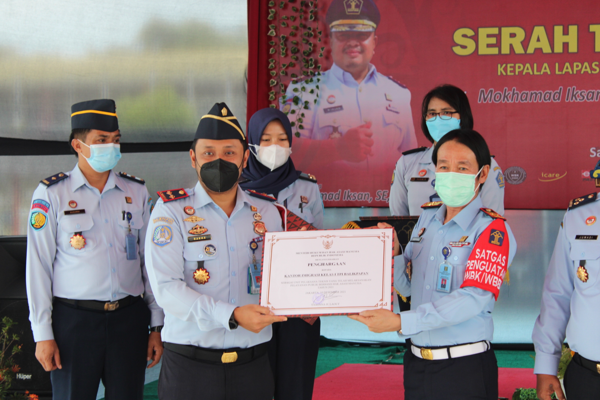 Bertempat di Aula Lapas Narkotika Kelas IIA Samarinda pada Senin (13/12/2021) Kepala Kantor Imigrasi Kelas I TPI Balikpapan, Rakha Sukma Purnama menerima Piagam Penghargaan Pelayanan Publik Berbasis HAM Tahun 2021 yang diserahkan Kepala Kantor Wilayah Kemenkumham Kalimantan Timur.