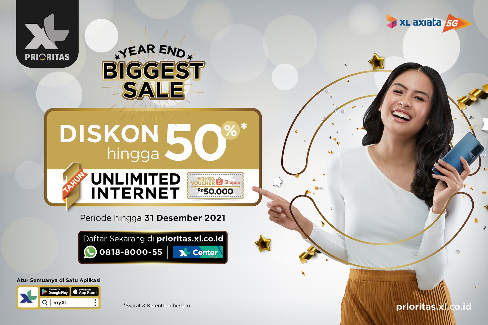 dari Shopee senilai Rp50.000 selama persediaan masih ada. Seluruh promo ini berlaku khusus untuk pelanggan baru yang mendaftar paket myPRIO X Unlimited hingga 31 Desember 2021.