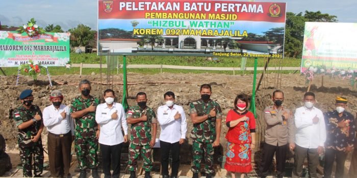 BorneoFlash.com, TANJUNG SELOR – Rangkaian acara peresmian kantor Makorem 092/Maharajalila juga dilakukan peletakan batu pertama pembangunan Masjid Hizbul Wathan Korem 092/Maharajalila oleh Panglima Kodam VI/Mlw bertempat di Jalan Katamso Tanjung Selor, Rabu (22/12/2021).