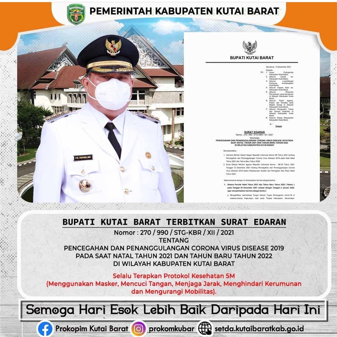 BorneoFlash.com, SENDAWAR - Bupati Kutai Barat (Kubar), FX Yapan kembali mengeluarkan surat edaran (SE) tentang pencegahan dan penanggulangan Covid-19 pada saat Natal tahun 2019 dan tahun baru 2022 di wilayah Kabupaten Kutai Barat.