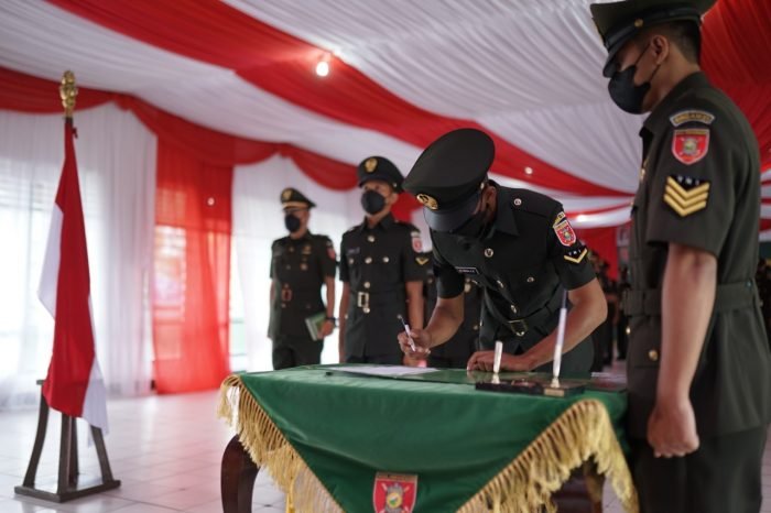 BorneoFlash.com, BANJARBARU – Pangdam VI/Mulawarman Mayjen TNI Teguh Pudjo Rumekso secara resmi melantik 81 prajurit siswa yang mengikuti Pendidikan Pertama Bintara TNI-AD (Dikmaba) TA 2021 Melalui Virtual bertempat di Aula kesetiaan Mako Secaba Rindam VI/Mulawarman Banjarbaru, Jumat (11/02/2022).
