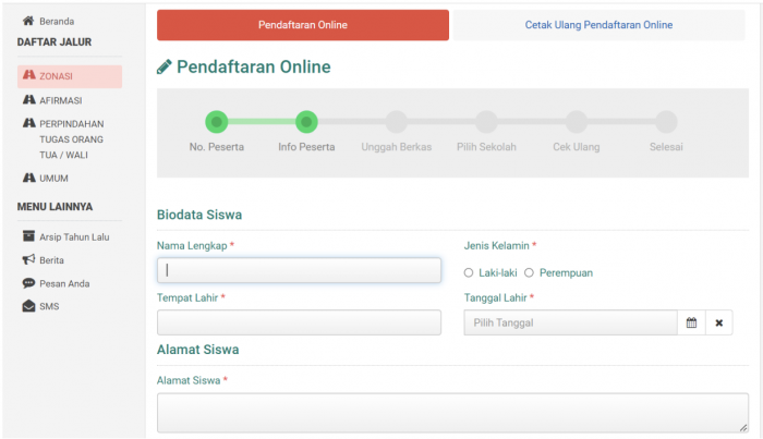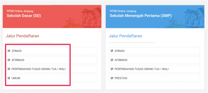 Pilih jalur pendaftaran yang dituju terdapat empat jalur pendaftaran zonasi, Afirmasi, Perpindahan tugas orang tua wali, umum
