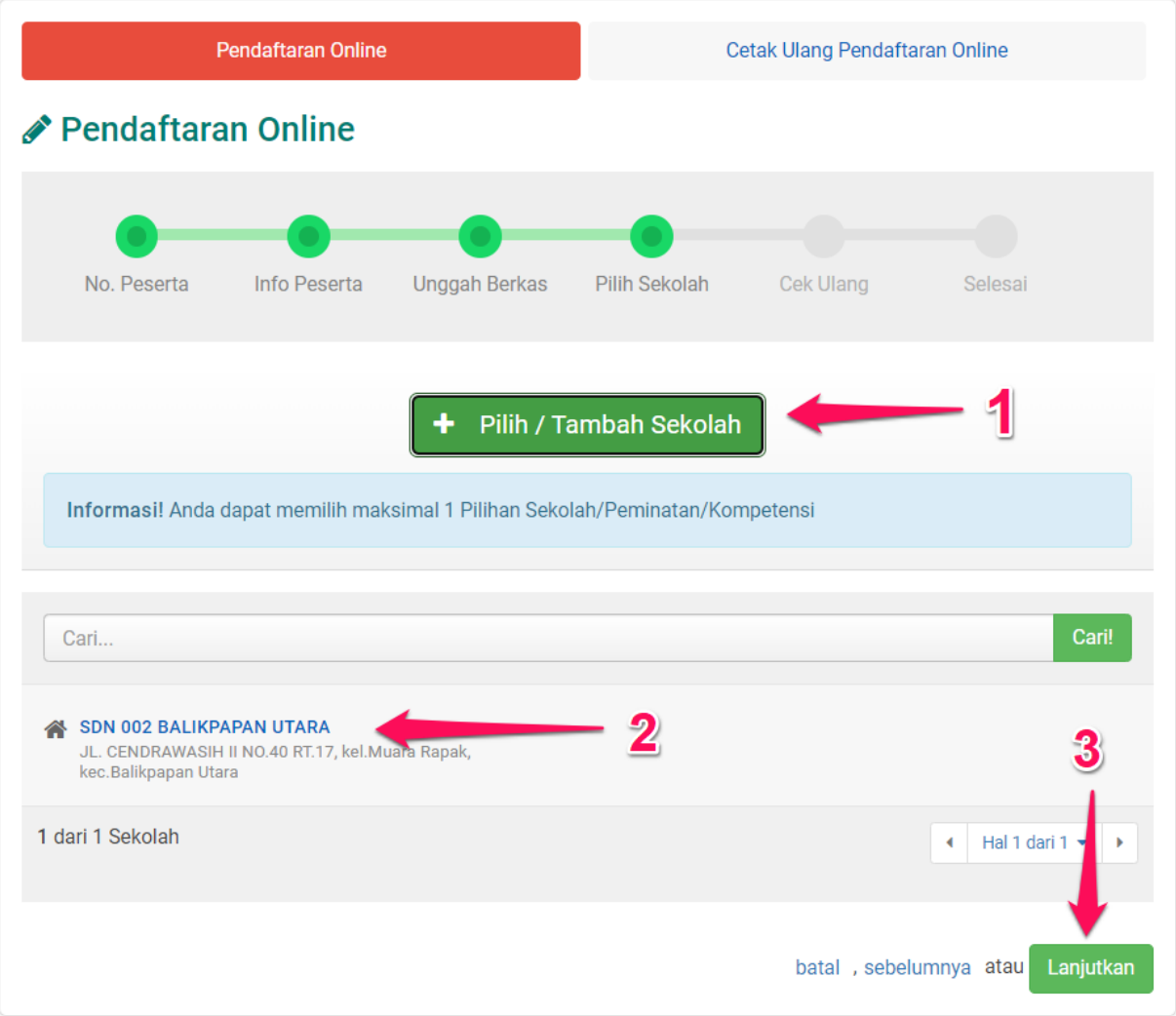 Klik Pilih / Tambah Sekolah kemudian klik pada Nama Sekolah yang diinginkan, setelah semua sekolah yang dipilih sudah terpilih maka klik tombol Lanjutkan.