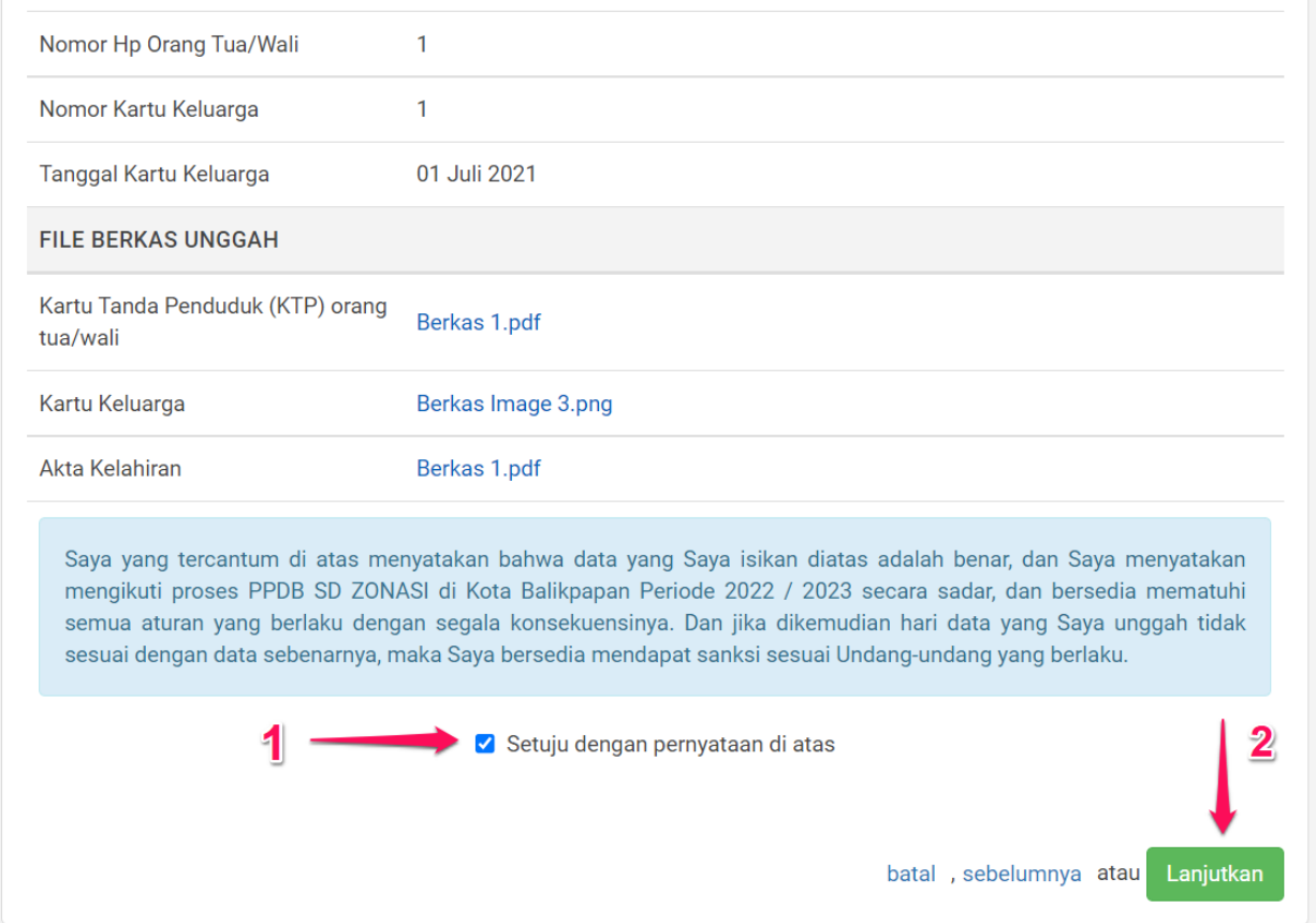 Periksa kembali data yang sudah diisikan, jika sudah sesuai klik centang Setuju dan klik tombol Lanjutkan