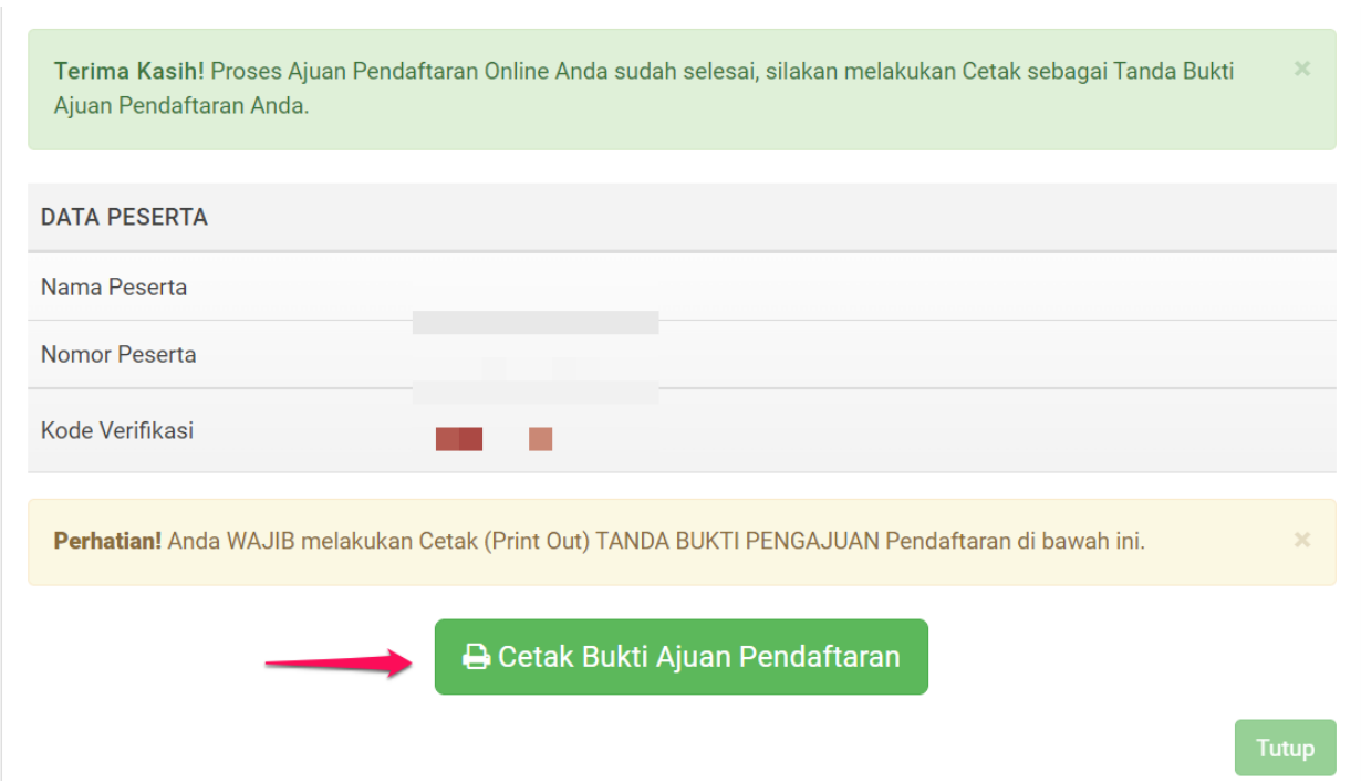 Klik Cetak Bukti Ajuan Pendaftaran dan simpan cetak ini sebagai bukti telah mengajukan pendaftaran.