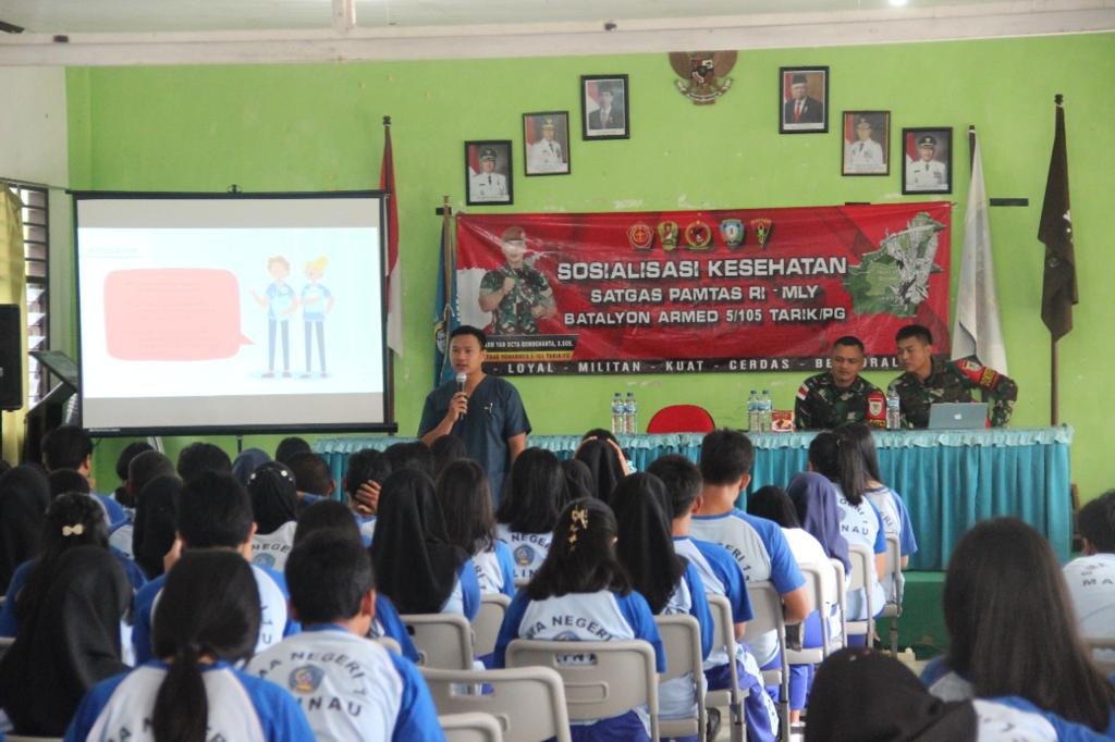 BorneoFlash.com, MALINAU - Satgas PamtasYon Armed 5/105 Tarik/PG bidang teritorial bekerjasama dengan Dinas Kesehatan (Dinkes) Kabupaten Malinau melaksanakan sosialisasi Kesehatan di SMAN 1 Malinau dengan materi Bantuan Hidup Dasar (BHD) dan pendidikan seks untuk mencegah seks bebas dan Infeksi Menular Seksual (IMS) di kalangan remaja. Diikuti 200 peserta dari kelas XI. Jumat (26/08/2022).