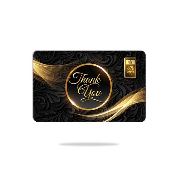 Emas antam ini memiliki desain sangat menarik dengan warna gelap yang elok. Tulisan“ Thank You” yang terletak pada tengah kartu emas ini mempunyai warna kuning keemasan yang sangat anggun.