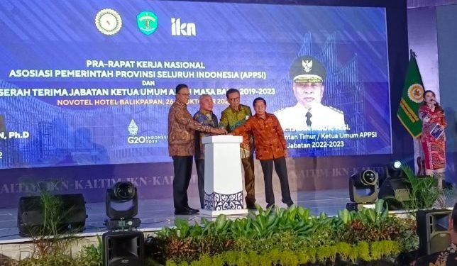 Serah terima jabatan dari Anies Rasyid Baswedan kepada H Isran Noor ditandai dengan Penyerahan bendera pataka APPSI kepada Isran Noor, dalam pembukaan Pra Rapat Kerja Nasional (Rakernas) APPSI tahun 2023, di Hotel Novotel Balikpapan, Rabu (26/10/2022) malam.