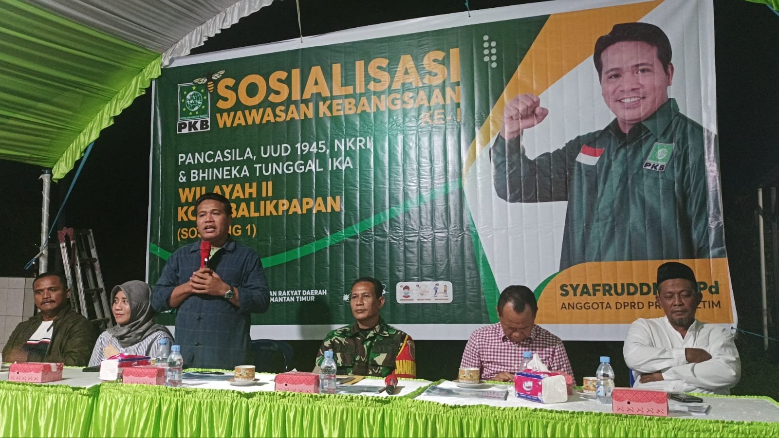Pada kesempatan itu, Anggota DPRD Provinsi Kalimantan Timur (Kaltim), Syafruddin menyampaikan bahwa tujuan dari Sosialisasi Kebangsaan empat pilar yakni Pancasila, UUD 1945, Negara Kesatuan Republik Indonesia (NKRI) dan Bhineka Tunggal Ika, agar warga bangsa memiliki kekuatan melawan pengaruh atau ancaman yang ingin memecah belah bangsa, baik yang datang dari dalam maupun dari luar.
