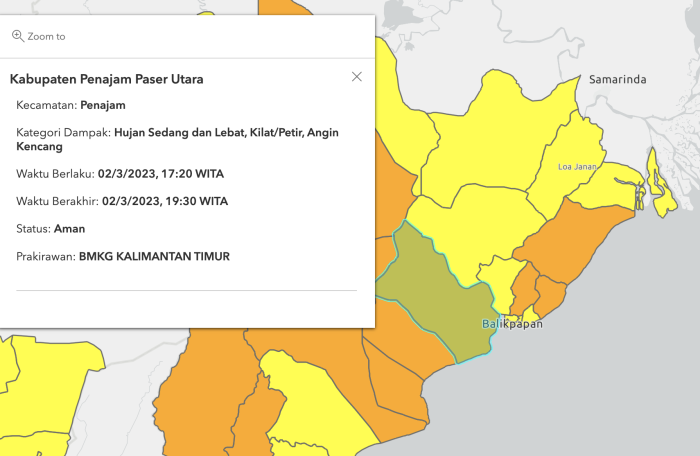 Kemungkinan dapat meluas ke wilayah Kabupaten Kutai Kartanegara (Muara Muntai, Loa kulu, Loa Janan) dan Kutai Barat (Melak, Muara lawa, Jempang, Siluk ngurai). Peringatan dini ini diperkirakan masih berlangsung hingga pukul 19.30 Wita.