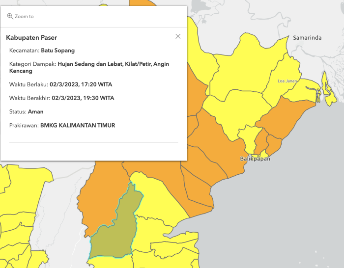 Peringatan dini cuaca tersebut mencakup beberapa wilayah di Kalimantan Timur, antara lain Kabupaten Paser (Paser Belengkong, Muara Komam Long Kali, Tanah Grogot, kuaro, long Ikis, Muara Samu),