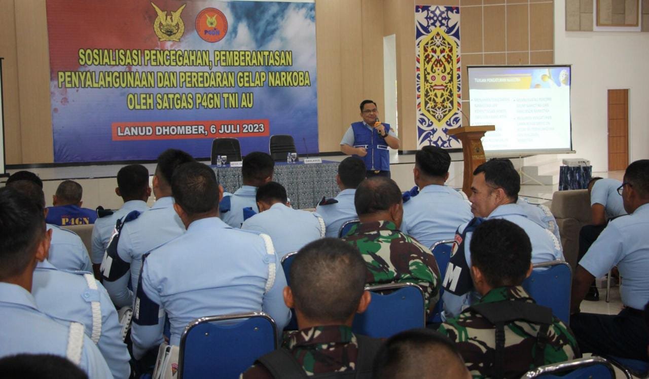 Diawali dengan giat pemeriksaan urine yang diikuti oleh personel Lanud Dhomber dan Satrad 223, Balikpapan, Sosialisasi P4GN ini bertujuan untuk memberikan pemahaman dan pengetahuan mendalam tentang Narkotika dan akibat yang ditimbulkan dari aspek hukum yang disampaikan oleh Kolonel Sus Muhammad Yani, SH, MH, aspek POM oleh Kolonel Pom Tatiet Rosadi, CTMP., aspek bintal oleh Letkol Sus Drs. Ahmad Mediansyah, M.Ag dan aspek kesehatan oleh Letkol Kes Indro Cuk W, A.Md. sebagai langkah pre emptive dan preventif serta represif terhadap penyalahgunaan dan peredaran Narkotika di lingkungan TNI AU.