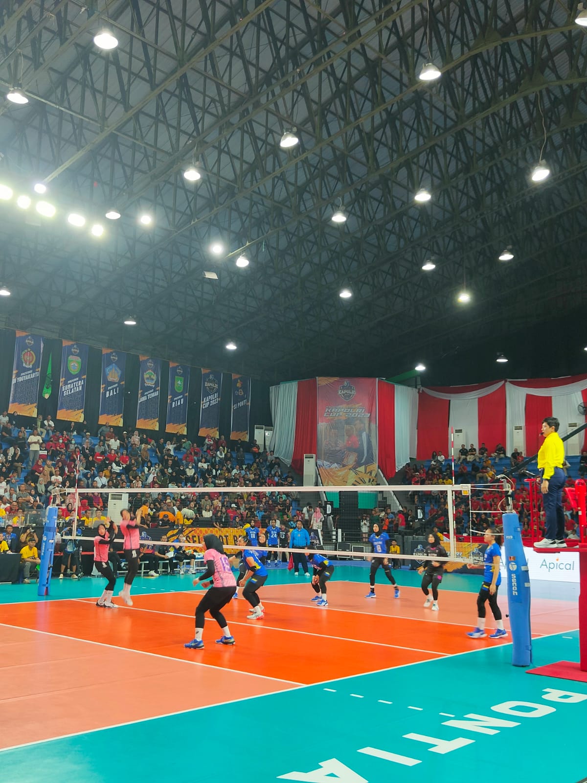 Dengan skor akhir 25-22 pada set pertama, Tim Voli Putri Kaltim membuka jalan menuju kemenangan dengan percaya diri.