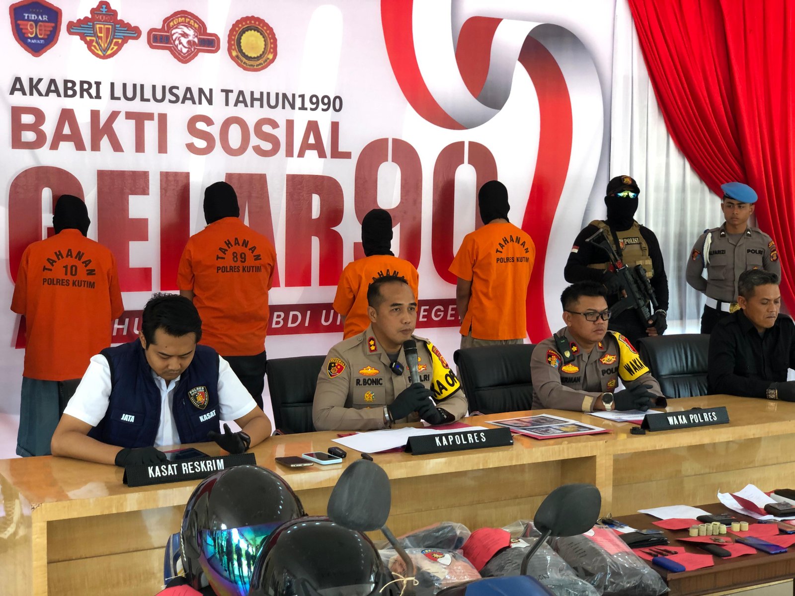 Satreskrim Polres Kutai Timur mengamankan barang bukti diantaranya 1 buah HP Iphone 11, 1 buah HP Vivo, 1 HP Oppo Warna gold, 1 HP Vivo V20, 1 unit motor Honda GTR merah hitam, 1 unit motor Mio J warna biru putih, 3 besi modifikasi pecah kaca, 1 buah pecahan besi motor, 1 jaket warna orange biru tulisan JEEP, 1 kartu ATM BANK BNI an. M. Husni Thamrin, 1 kartu ATM BANK BNI an. Hamzah, Uang Tunai Rp 83.000, dan 4 helm warna hitam.