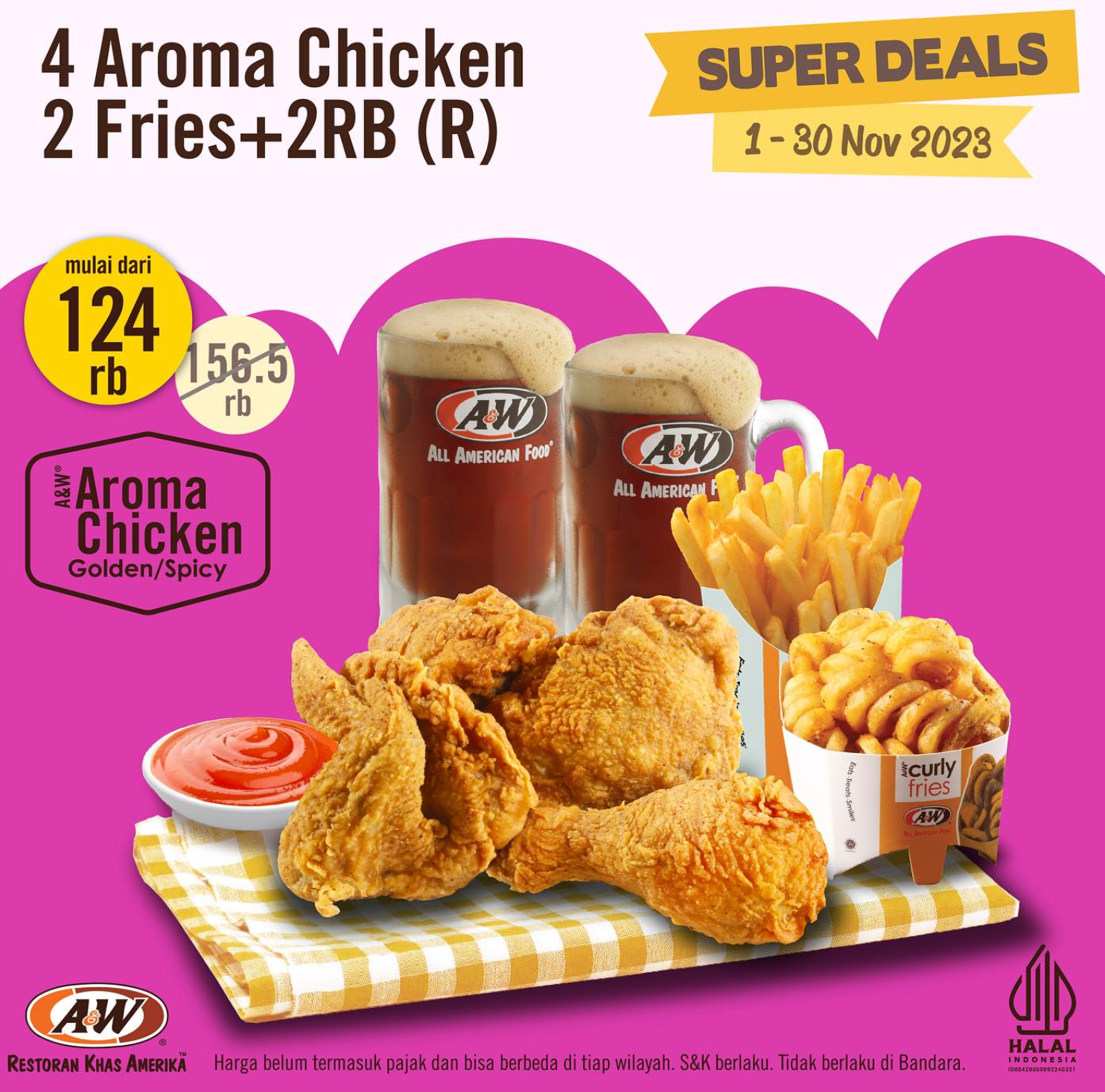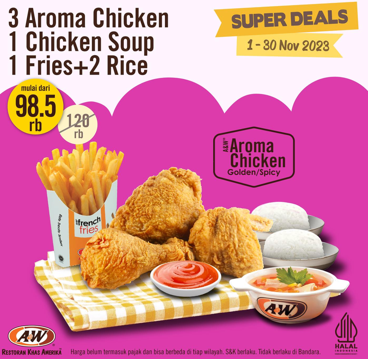 Promo ini menawarkan paket yang terjangkau berupa ayam, sup, nasi, dan snack. Nikmati Aroma Chicken, Curly Fries, dan Bir mulai dari Rp124.000, promo ini berlaku dari tanggal 1 hingga 30 November 2023 di semua gerai A&W Indonesia.