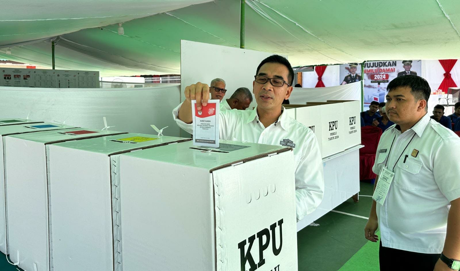 Saat pelaksanaan pemungutan Pemilu Tahun 2024, Gun Gun Gunawan didampingi Kepala Divisi Pemasyarakatan, Heri Azhari untuk menunaikan kewajibannya sebagai warga negara dengan memberikan suaranya di Rumah Tahanan Negara (Rutan) Kelas IIA Samarinda, pada hari Rabu (14/2/2024).