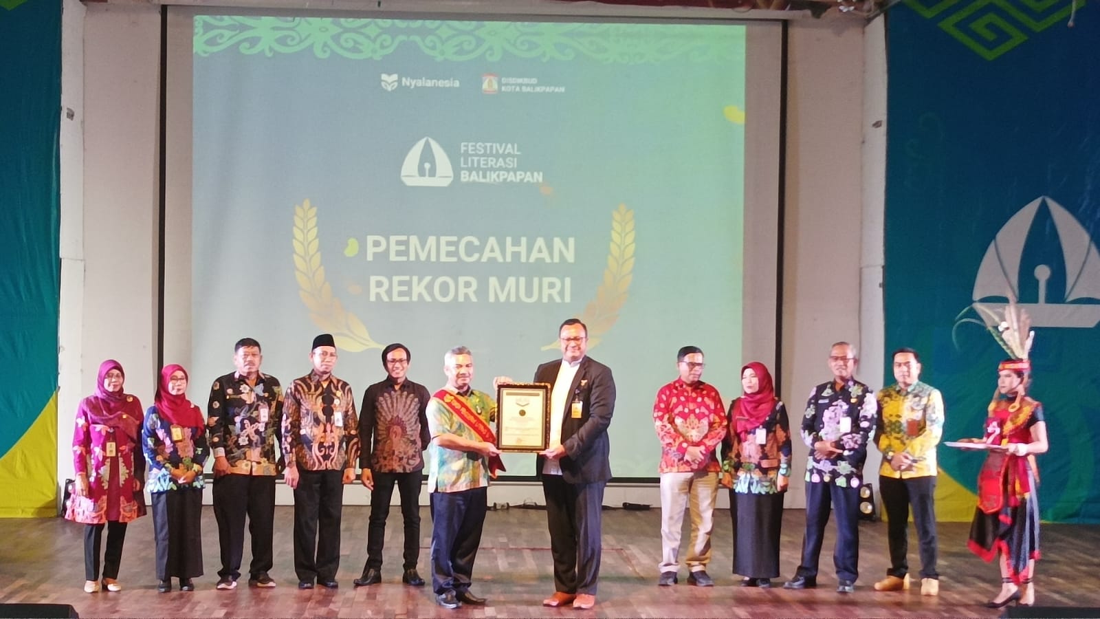 Penghargaan diserahkan langsung oleh Direktur Marketing MURI, Awan Rahargo kepada Staf Ahli Bidang Sosial, Kesejahteraan dan Pengembangan SDM Sekretariat Daerah (Setda) Kota Balikpapan, Adamin Siregar, mewakili Wali Kota Balikpapan H Rahmad Mas'ud, pada Puncak Festival Literasi Balikpapan Tahun 2023, di Gedung Kesenian Balikpapan, pada hari Kamis, 18 April 2024.
