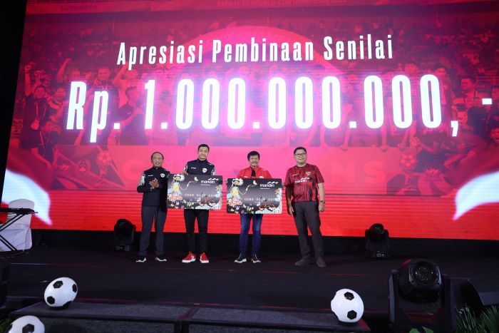 Direktur Utama Bank Mandiri, Darmawan Junaidi menyerahkan dana pembinaan senilai Rp1 miliar secara simbolis kepada kapten tim U-19, Dony Tri Pamungkas dan pelatih Indra Sjafri. Dalam acara malam apresiasi yang berlangsung di Plaza Mandiri, Jakarta, pada Rabu (31/7/2024).