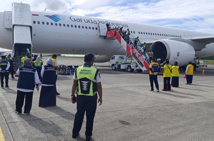 Pesawat Garuda Indonesia GA 4415 yang membawa rombongan dari Madinah mendarat mulus di stand 18 khusus pesawat haji, disambut 10 unit bus yang sebelumnya telah standby di area Fire Station lama sejak pukul 08.28 WITA. Total 356 orang dalam rombongan ini terdiri dari: