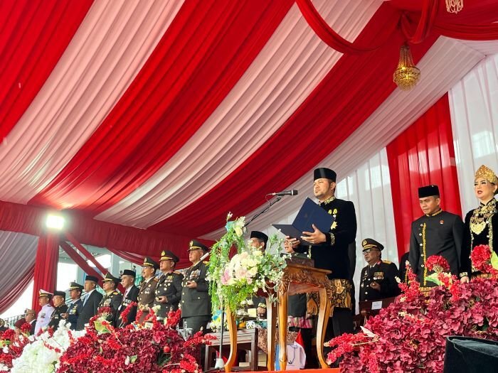 Gubernur Rudy Dengan balutan pakaian adat Kutai, Baju Takwo hitam, yang seakan menegaskan harmoni antara kearifan lokal dan semangat kebangsaan.
