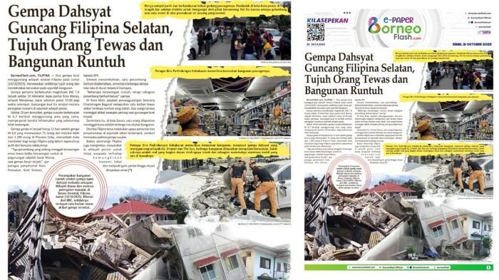 BorneoFlash.com, FILIPINA — Dua gempa kuat mengguncang wilayah selatan Filipina pada Jumat (10/10/2025), menewaskan sedikitnya tujuh orang dan menyebabkan kerusakan pada sejumlah bangunan.