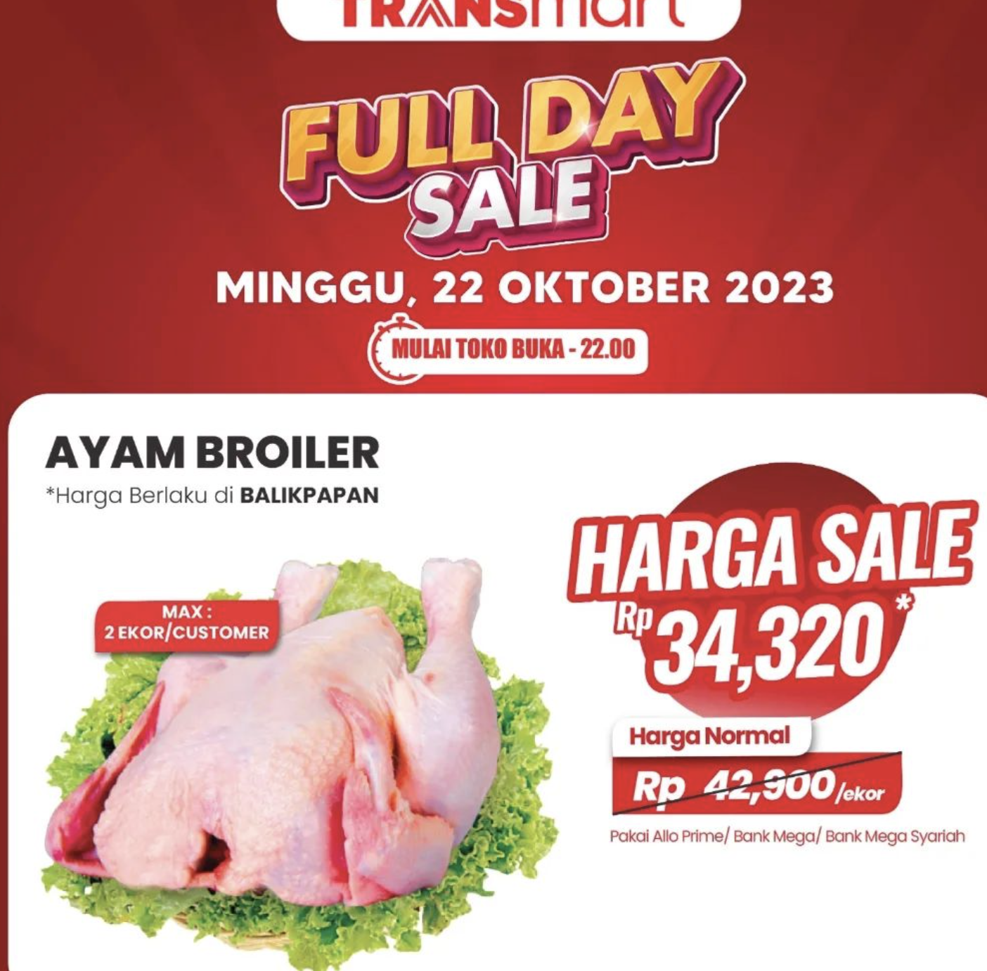 Transmart Full Day Sale kembali menggebrak dengan diskon besar-besaran, memberikan potongan harga sebesar 50 persen ditambah 20 persen.