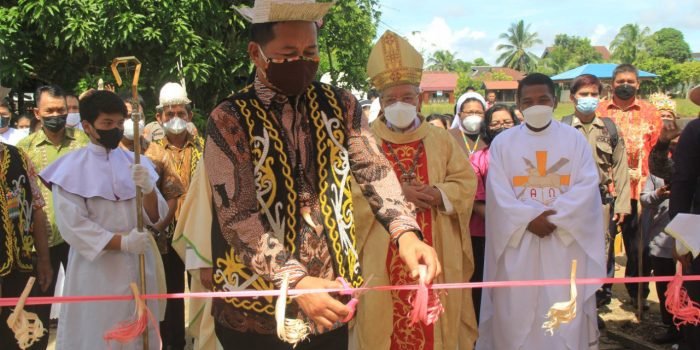 Bupati Mahakam Ulu (Mahulu) Bonifasius Belawan Geh, SH ME bersama Uskup Agung Samarinda Mgr Yustinus Harjosusanto, MSF meresmikan gereja Katolik Stasi Santo Stepanus di Kampung…