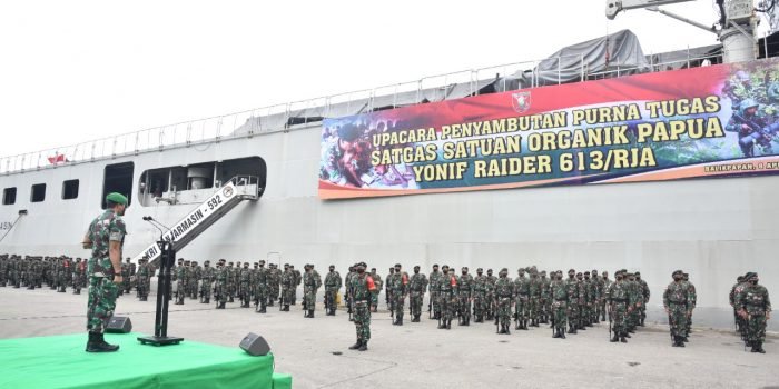 Danyonif 613/Raja Alam Pangdam VI/Mlw Pimpin Upacara Penyambutan Purna Tugas Satgas Yonif Raider 613/Raja Alam