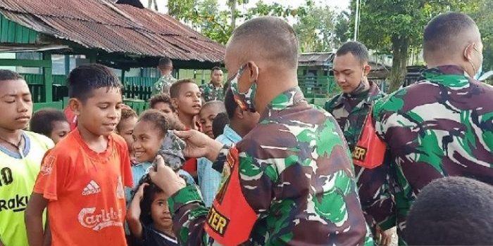 Kampung Workwana Satgas Pamtas Yonif Mekanis 403/Wirasada Pratista Bagikan Susu dan Makanan Gratis Untuk Anak di Perbatasan