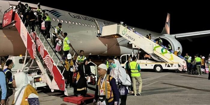 Jemaah haji kloter 1 asal Kota Balikpapan, Kalimantan Timur (Kaltim) tiba di Bandara Sepinggan Balikpapan, Sabtu dinihari (8/7/2023) sekitar pukul 02:10 WITA
