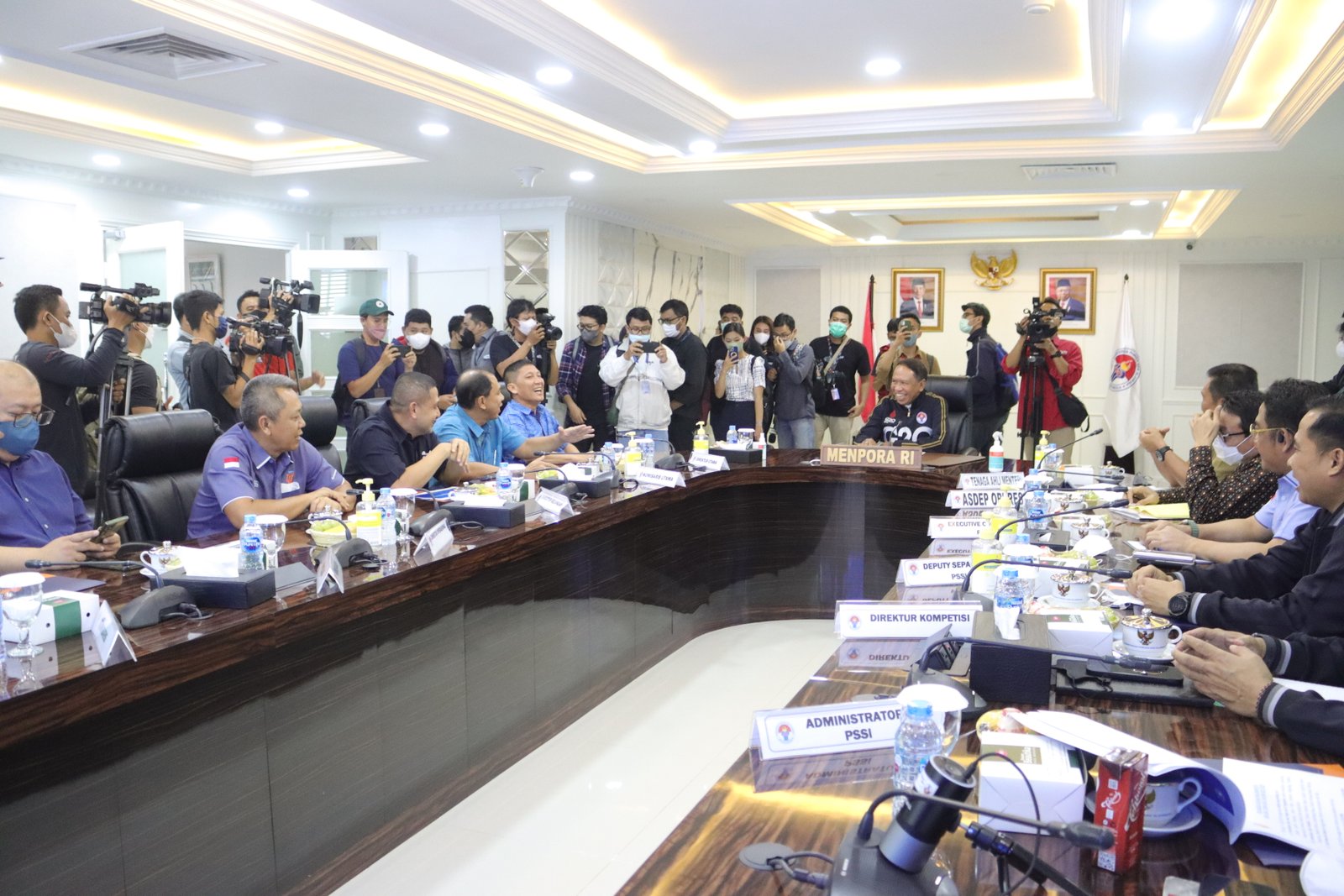 Kemenpora, PSSI, PT Liga Indonesia Baru (PT LIB), Polri, Kemenkes, Kementerian PUPR, BNPB, sepakat lanjutan BRI Liga 1 2022/2023 harus segera digulirkan.