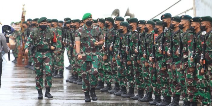 Pangdam VI/Mlw Mayjen TNI Teguh Pujo Rumekso pimpin Upacara Penyambutan Purna Tugas Satgas Yonif Raider 613/Raja Alam sebagai Satgas Satuan Organik Papua, yang berlangsung Pelabuhan…