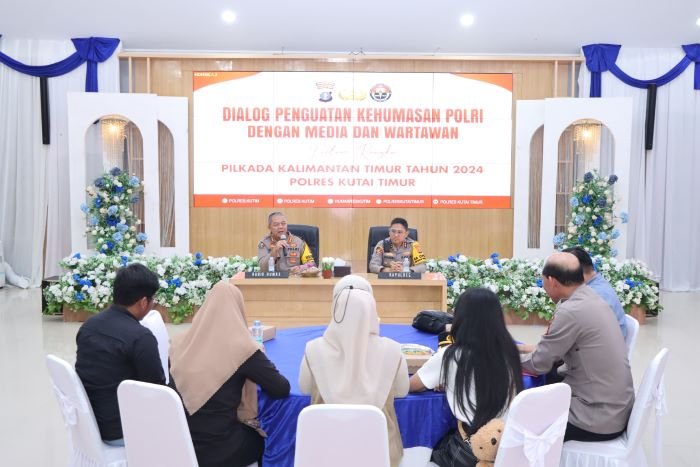 Kabid Humas Polda Kaltim Kombes Pol Yuliyanto, S.I.K., M.Sc., yang didampingi Kapolres Kutai Timur (Kutim), AKBP Chandra Hermawan, S.I.K., M.H., melakukan Dialog Kehumasan dengan tatap…