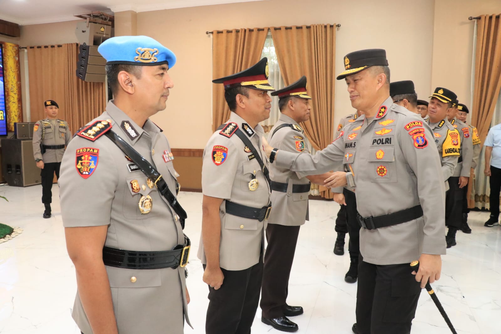 Kapolda Kaltim Irjen. Pol. Drs. Imam Sugianto, M.Si. pimpin upacara serah terima jabatan (Sertijab) pejabat utama Polda Kaltim di Gedung Mahakam Polda Kaltim, Selasa (11/4/2023).