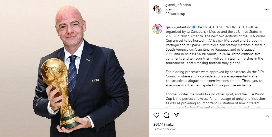 Presiden FIFA, Gianni Infantino, resmi mengumumkan bahwa Arab Saudi akan menjadi tuan rumah Piala Dunia 2034.